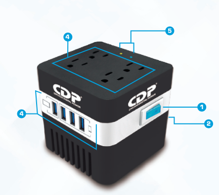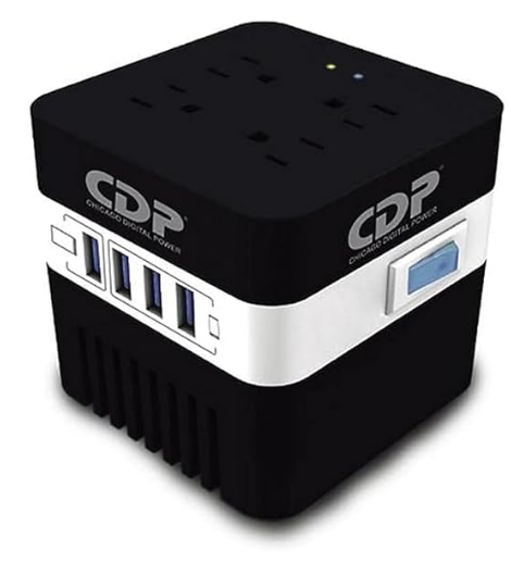 Regulador de voltaje automático de 600 VA con protección contra sobre tensiones y cargador USB de 4 puertos y 4 toma corrientes NEMA 5-15 regulados montados en la parte superior. Mini indicadores LED para potencia y calidad de voltaje de entrada. Disyuntor de sobrecarga combinado de encendido / apagado para proteger la carga y plástico que cumple con UL anti flama para su seguridad.