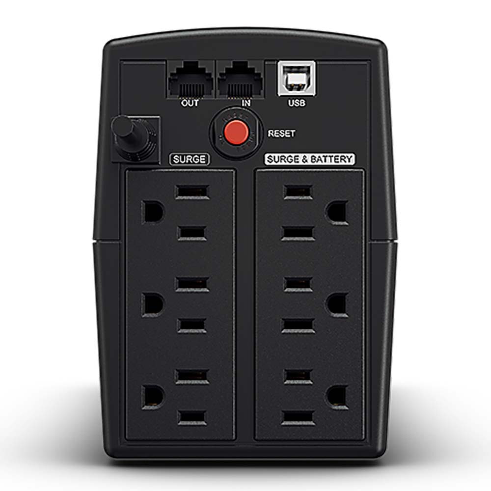 El puerto RJ11 / RJ45 incluido puede proporcionar protección de línea de datos contra sobretensiones y picos. Otras características incluyen salidas protegidas contra sobretensiones y filtro EMI para proteger sus dispositivos. Su diseño compacto permite a los usuarios colocarlo fácilmente debajo de escritorios u otros espacios reducidos.