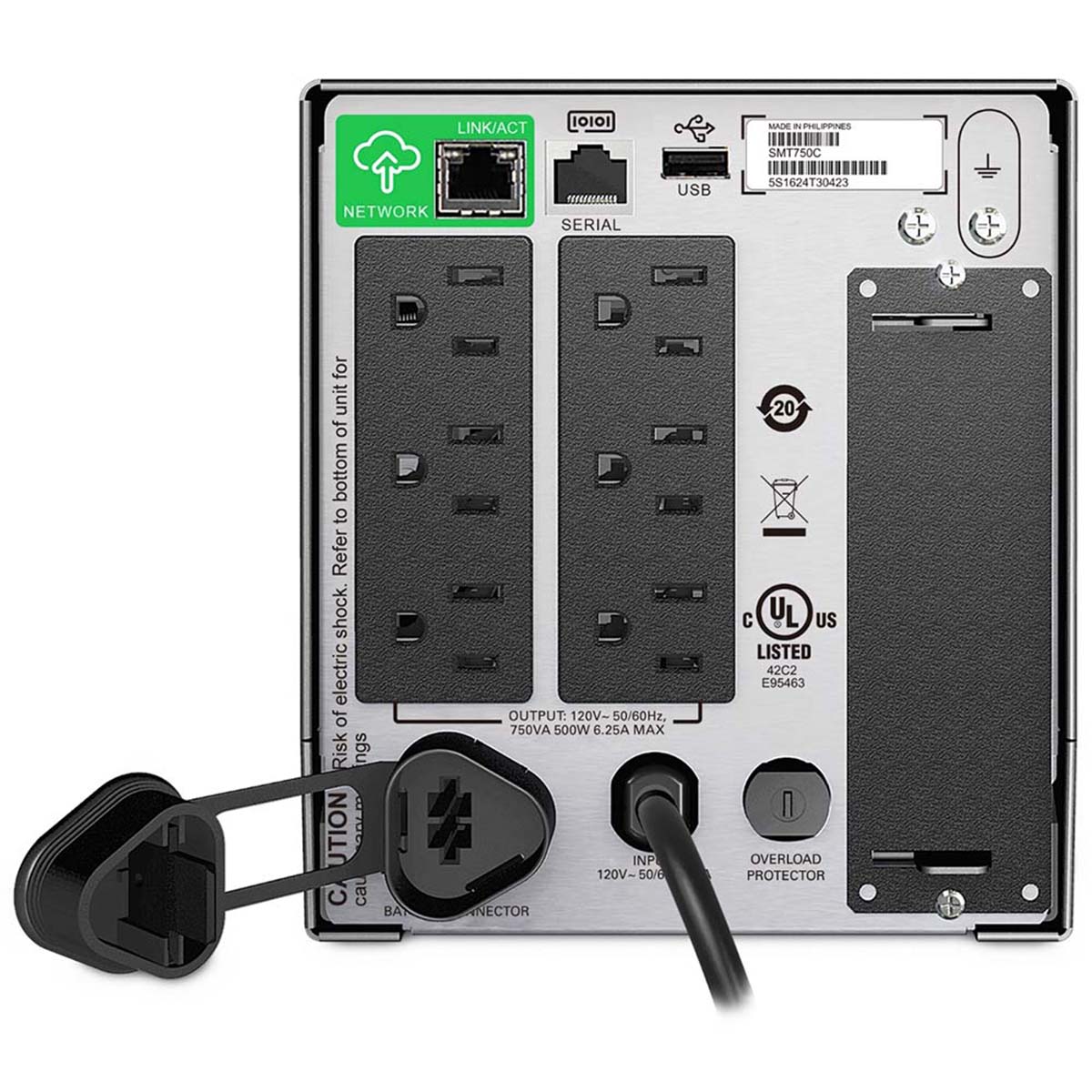 El No Break APC Línea Interactiva es un dispositivo de protección eléctrica que cuenta con una potencia de salida de 500W y capacidad de potencia de salida (VA) de 750 VA. Dispone de seis salidas AC NEMA 5-15R, las cuales permiten conectar diversos equipos electrónicos a la vez. Además, posee un puerto USB para cargar dispositivos móviles.
