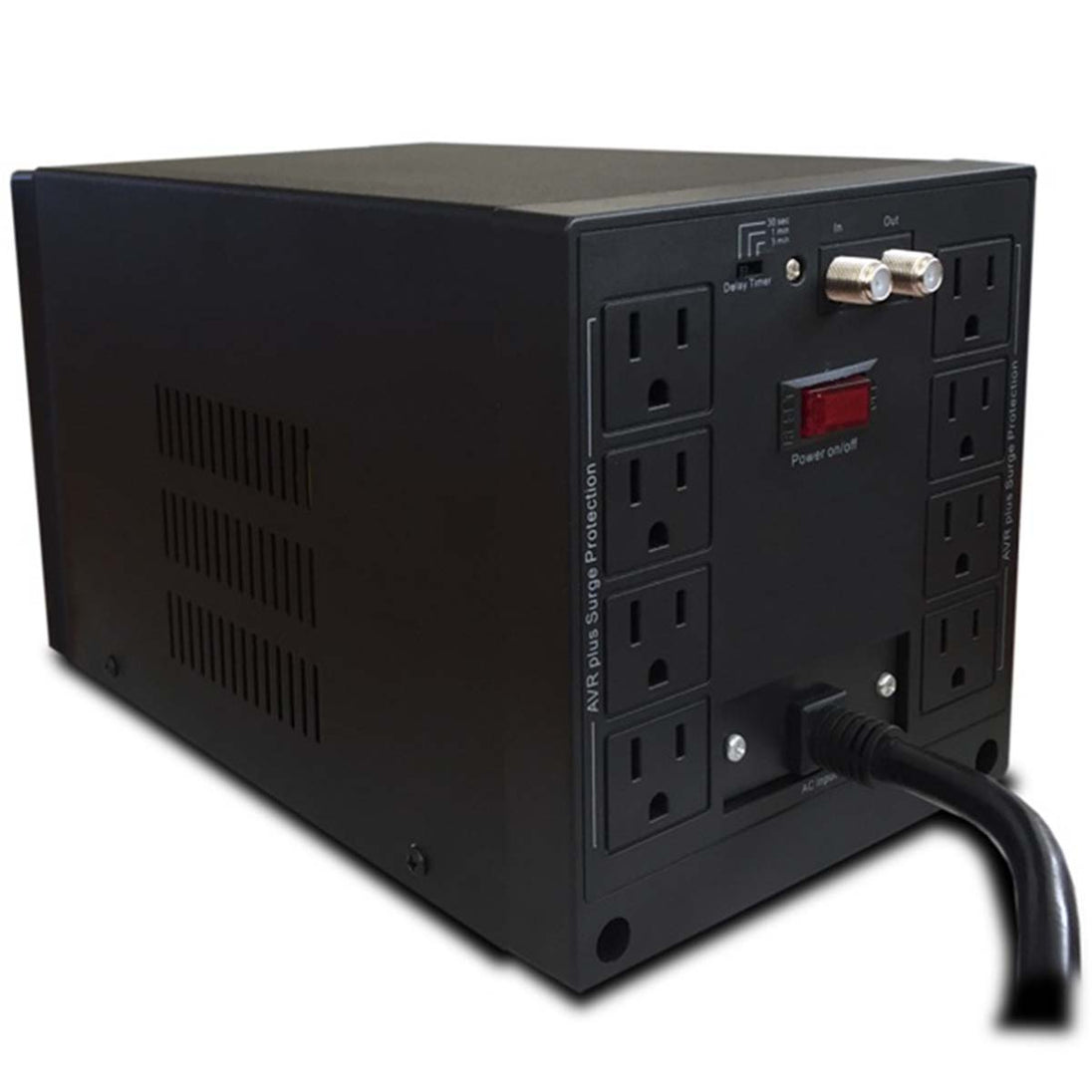 CDP R-AVR2408 2400 VA / 1200 W Regulador de voltaje automático (AVR), corrige variaciones de voltaje y ofrece condiciones de voltaje seguras, 8 Salidas Nema 5-15R, hasta 560 Julios de protección contra picos, Sistema de retardo de encendido ajustable a 30S, 1m o 3m después de un apagón o un bajón de voltaje peligroso, Protección Coaxial, 120 Vac